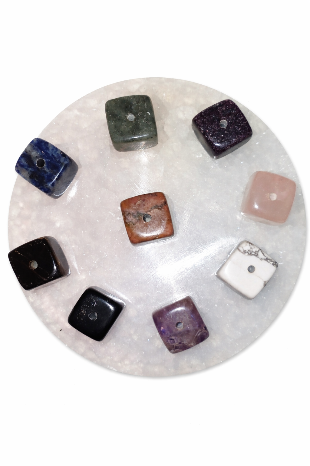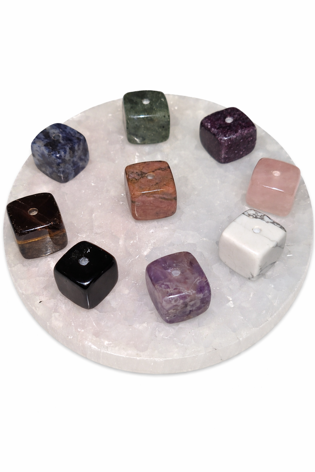 Chaque cube est unique, taillé dans des pierres naturelles soigneusement sélectionnées — améthyste, howlite, labradorite, obsidienne, œil de tigre, quartz rose, rhodonite ou sodalite. La pierre choisie vient enrichir l’atmosphère de votre espace de ses propres propriétés énergétiques.